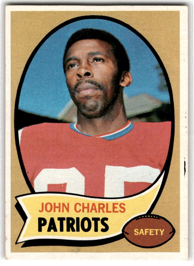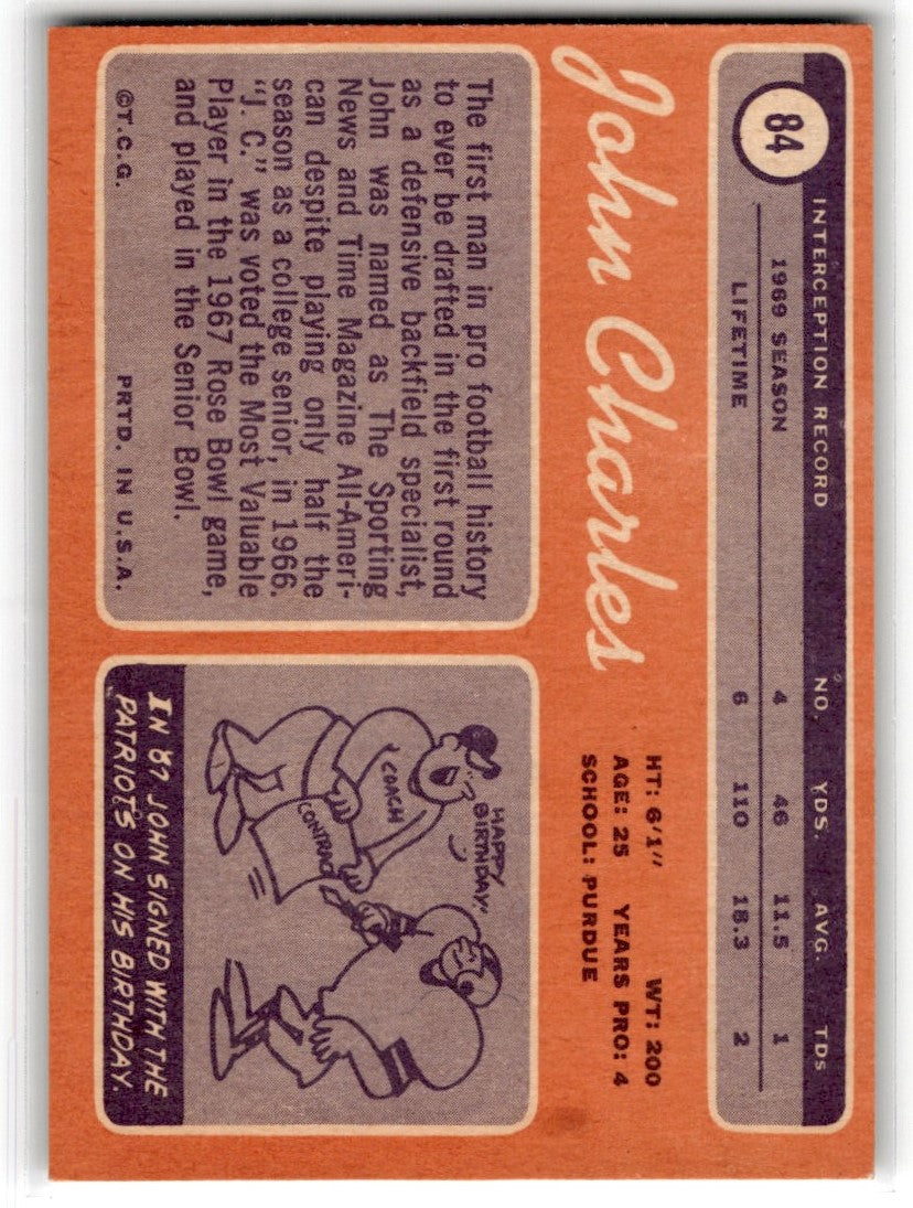This vintage 1970 Topps John Charles #84 Boston Patriots card is a must-have for any football fan! This card features an iconic image of the legendary Patriots player, showcasing his impressive athletic prowess. The card is printed on high-quality cardboard stock that has been carefully preserved to retain its original color and condition. It is an essential addition to any football card collection. Collect this timeless card now and commemorate the illustrious career of John Charles.