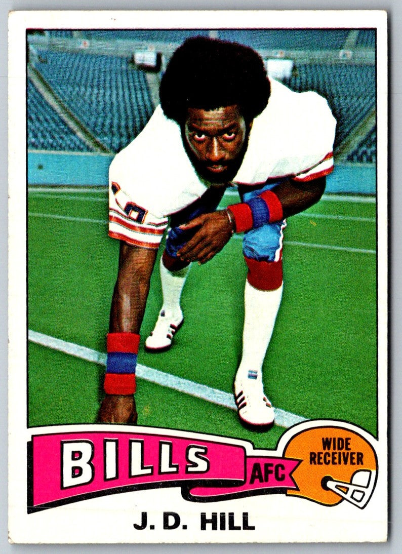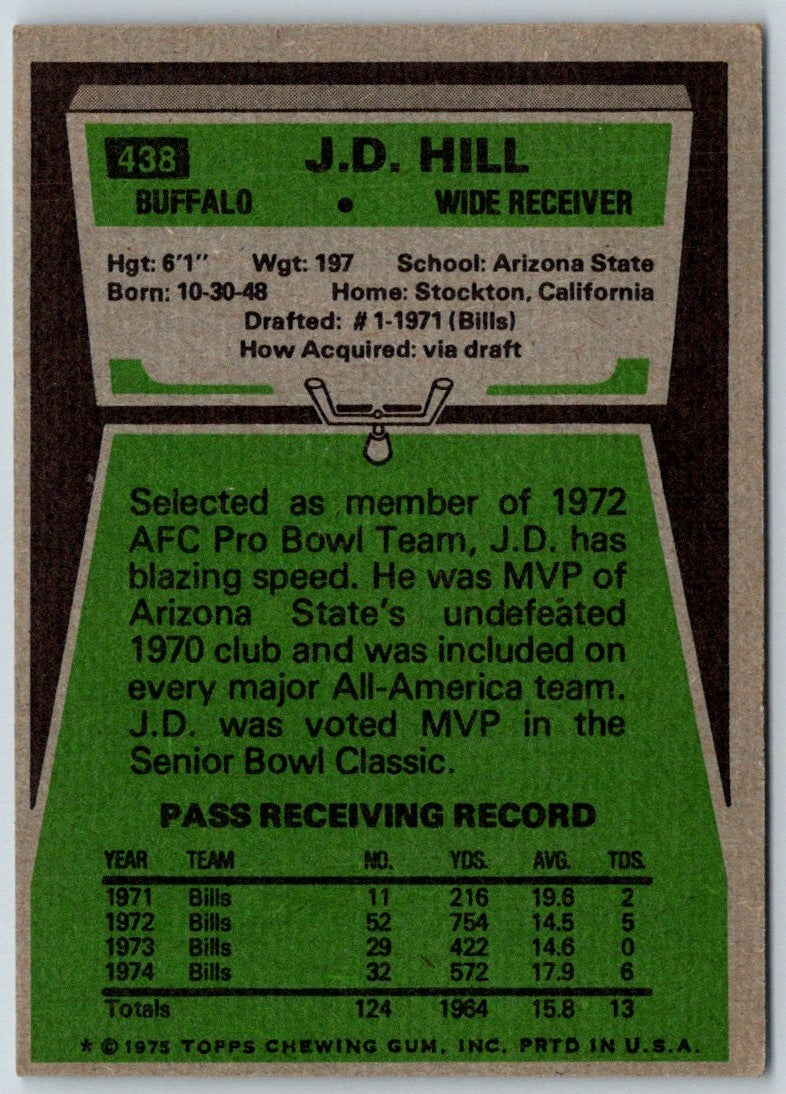 This 1975 Topps J.D. Hill #438 Buffalo Bills card is the perfect piece for any football fan! Hill was an incredibly talented player and his career spanned from 1972 to 1980. He was an efficient receiver and is remembered for his incredible speed and agility. This card shows Hill in his Bills uniform and captures the action and drama of the game. Get your hands on this classic piece today and add it to your collection today!