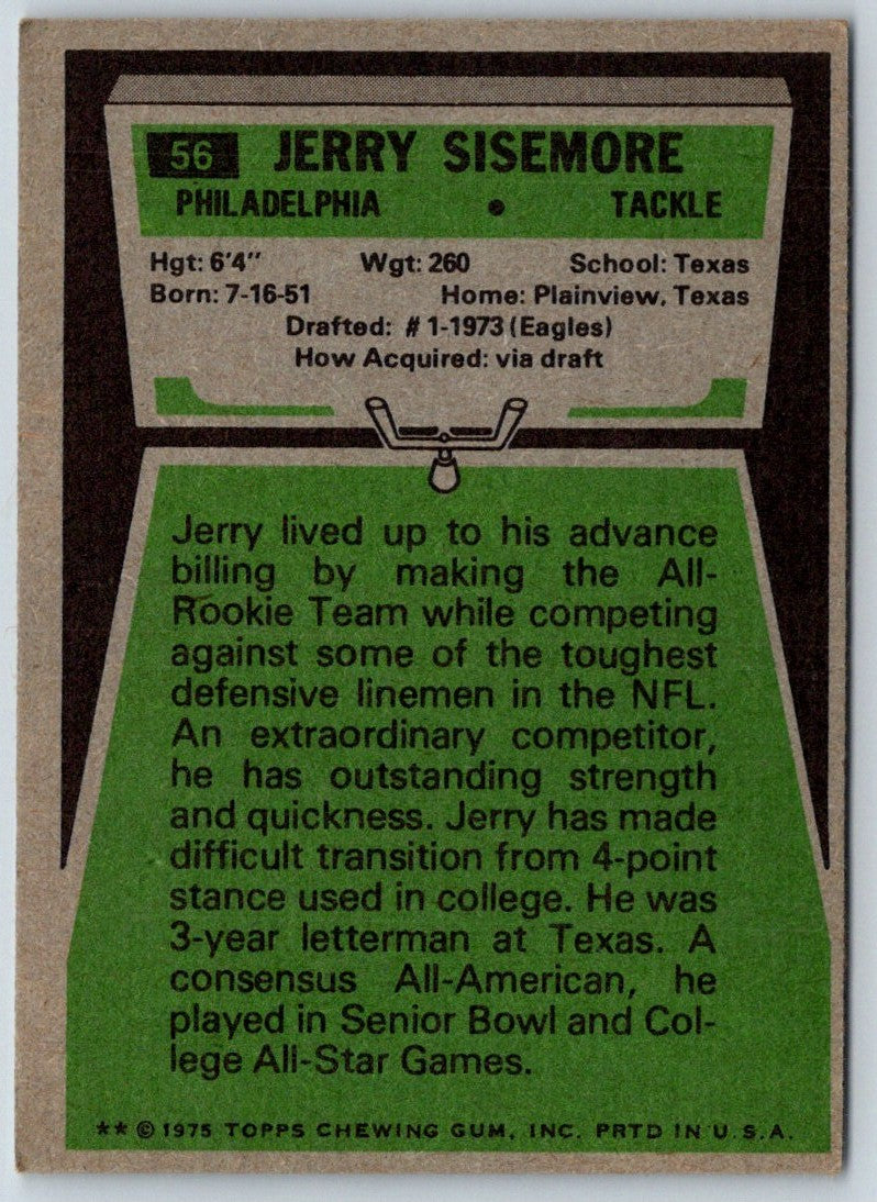 This 1975 Topps Jerry Sisemore card #56 from the Philadelphia Eagles is a must-have for any serious collector. Featuring a vibrant, full-color image of the NFL superstar, this card is in near mint condition and is sure to be a standout in any collection. With its classic design and bold colors, this card is a perfect representation of one of the NFL's greatest players. Add this vintage card to your collection today and be the envy of all your friends!