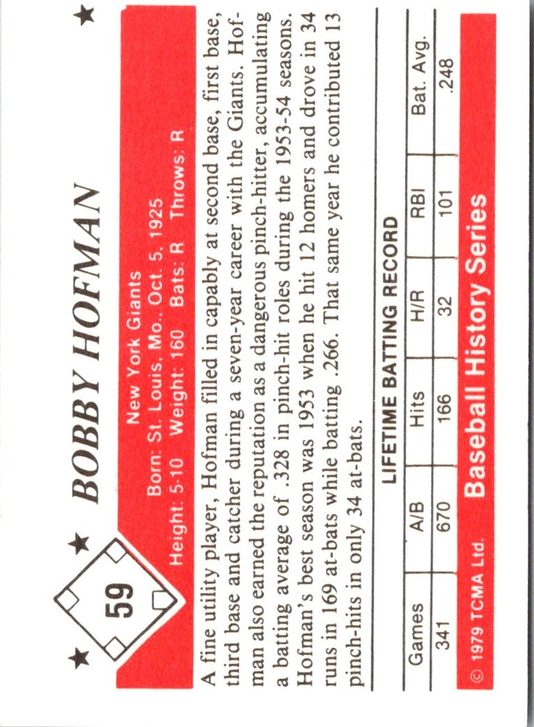 This 1979 TCMA 50's Bobby Hofman #59 New York Giants card is a must-have for any fan of the Giants. With its vibrant colors and classic design, this card is sure to make a great addition to any collection. Featuring Hofman as a member of the New York Giants in the 1950s, this card is a timeless piece of history. It is the perfect way to commemorate the glory days of the Giants and commemorate a legendary player. Get your hands on this card today and start reliving the Giants' golden era!
