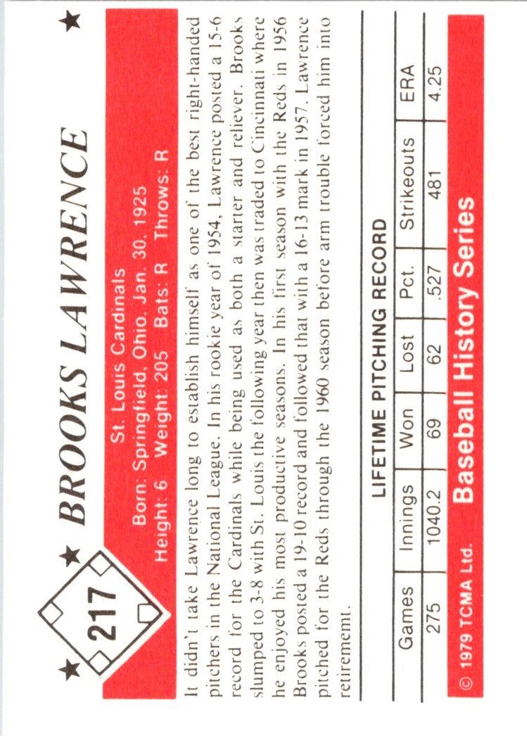 This 1979 TCMA 50's Brooks Lawrence #217 St. Louis Cardinals card is a must-have for any baseball fan! It features a vibrant color photo of the legendary Cardinals pitcher, along with his name, team, and position. The card is in excellent condition, with sharp corners and no creases or other signs of wear. With a classic design and a glossy finish, it's an ideal collectible for any Cards fan. Add this timeless card to your collection today!