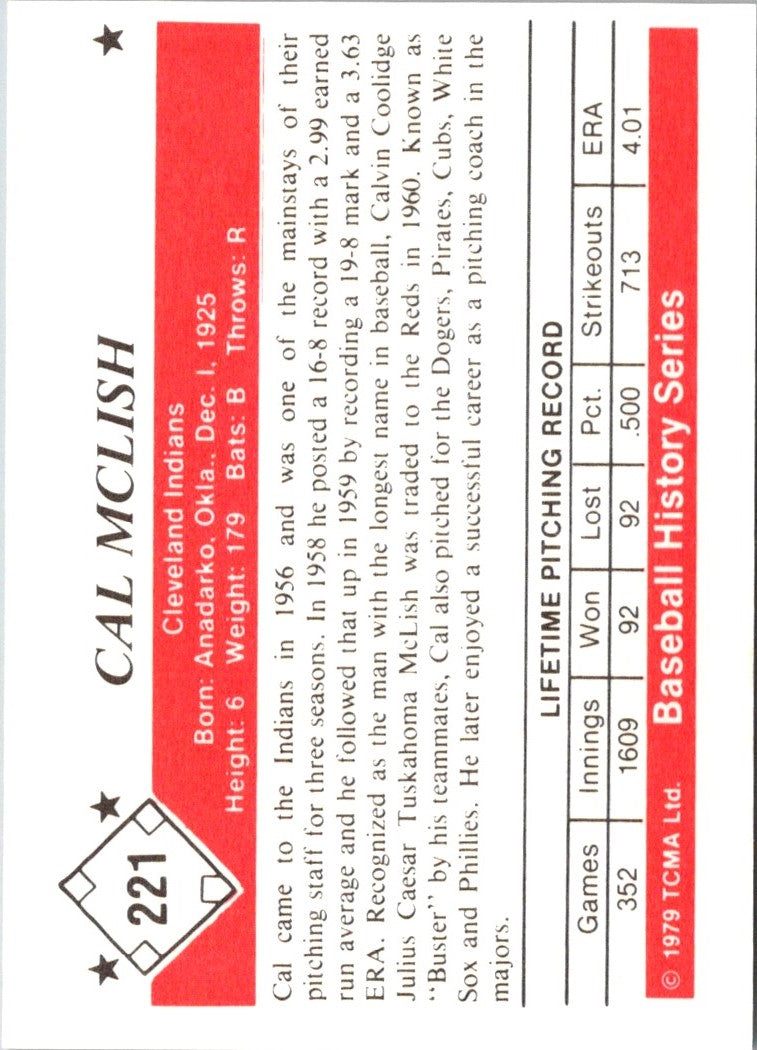 This 1979 TCMA 50's Cal McLish #221 Cleveland Indians card is the perfect addition for any Indians fan or collector. It features a photo of McLish in his Cleveland Indians uniform and is printed on high-quality card stock. The vibrant colors will bring any collection to life! This card is an essential for any fan of the Indians, and is sure to be a great conversation starter. Add it to your collection today!