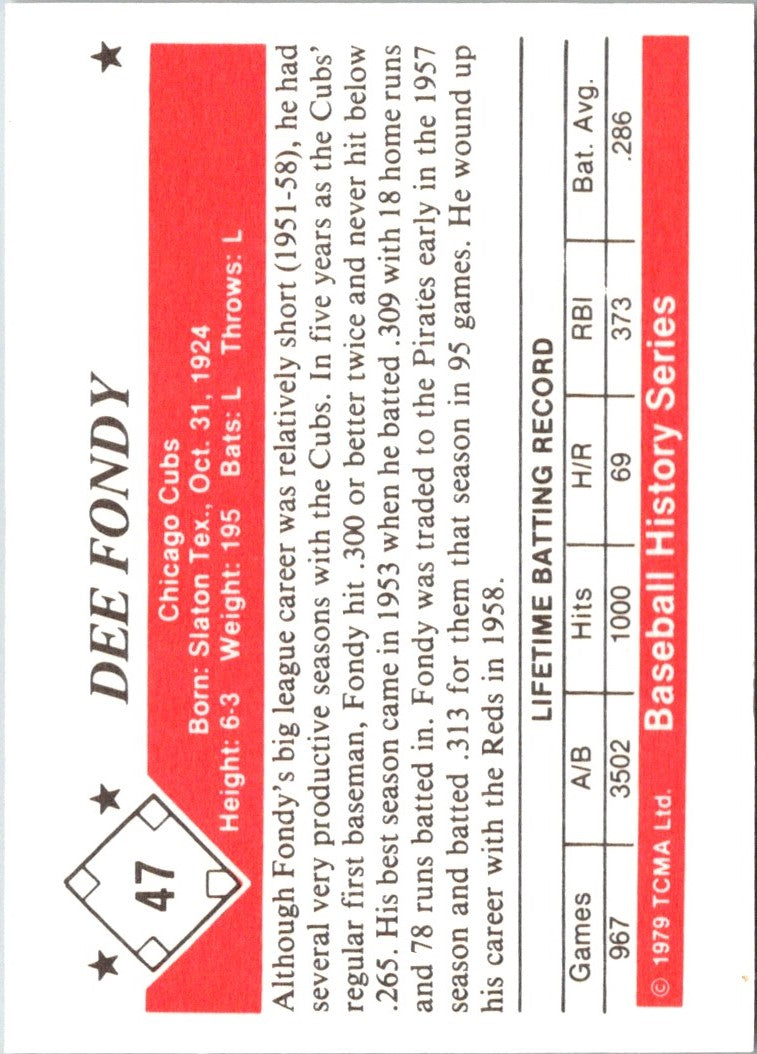 This classic 1979 TCMA 50's Dee Fondy #47 Chicago Cubs card is an ideal addition to any collector's collection. Featuring Fondy in his Cubs uniform, this card is sure to be a hit with any fan of the team. With vibrant colors and sharp corners, this card is sure to stand out in any collection. The back of the card features Fondy's stats and a brief biography of his career. This card is sure to be a great addition to your collection, so don't wait and get yours today!