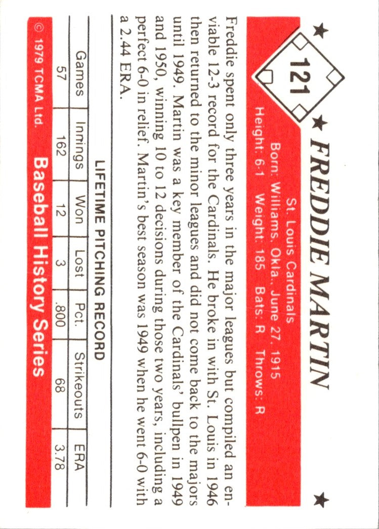 The 1979 TCMA 50's Freddie Martin #121 St. Louis Cardinals is a must-have for any Cardinals fan or baseball card collector. This card features a full-color image of Freddie Martin wearing his St. Louis Cardinals uniform. It also has his career stats printed on the back. With glossy surfaces and sharp corners, this card is sure to make a great addition to any collection. Add this classic piece of memorabilia to your collection today!