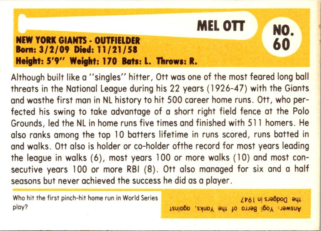Mel Ott #60 is a must-have collectible for any New York Giants fan. This authentic 1980 SSPC HOF (Hall of Fame) card features Mel Ott, one of the Giants' most decorated players. Since joining the team in 1926, Ott has racked up 511 home runs and a .304 batting average, making him one of the most successful players of his era and one of the most influential figures in baseball history. This card is a great way to commemorate Ott's career and show your support for the Giants. With its bold colors and crisp imagery, it's sure to be a great addition to your collection.
