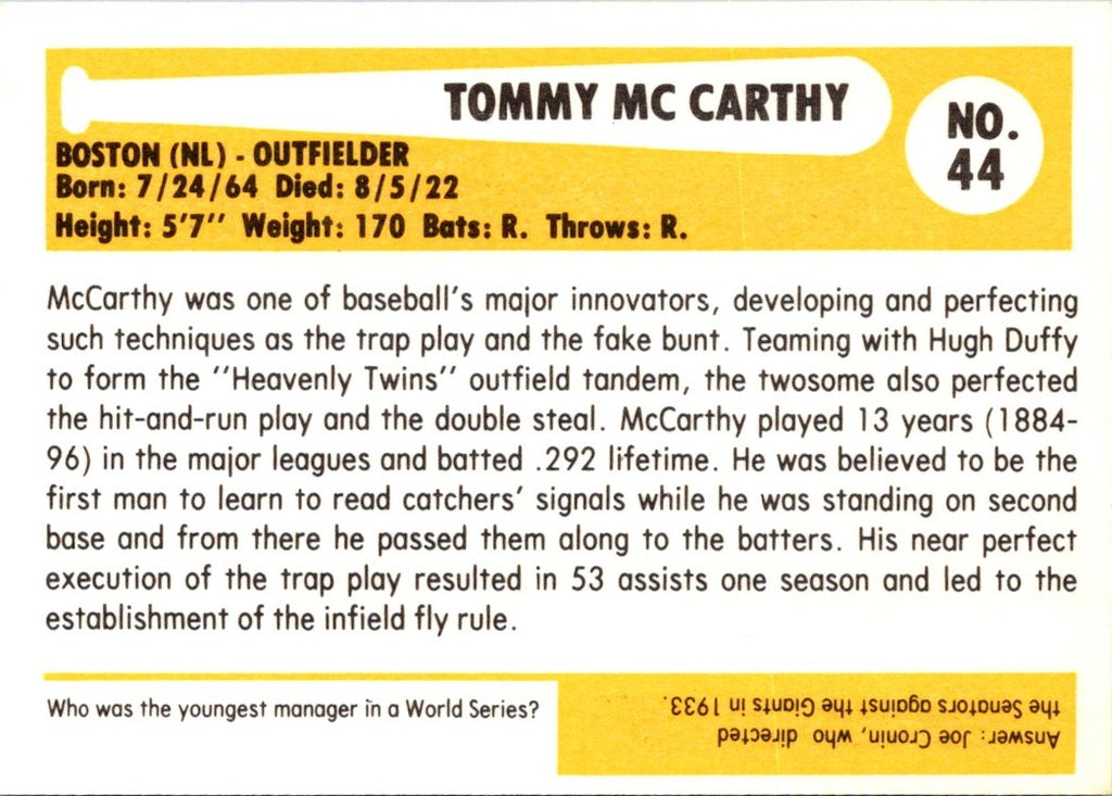 This 1980 SSPC HOF Tom McCarthy #44 Boston Beaneaters is a must-have item for any baseball card collector. This card features a sharp image of the great Tom McCarthy in his Beaneaters uniform. His career batting average of .287 and his World Series championship with Boston in 1894 make him an important part of baseball history. This card is an excellent way to honor McCarthy's contributions to the game. Add this card to your collection today and show your appreciation for one of the most influential players in the game!