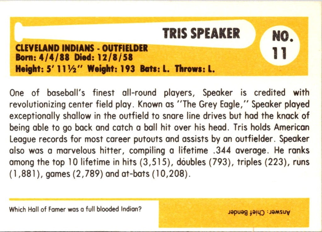 This 1980 SSPC Tris Speaker #11 Cleveland Indians card is a great addition to any fan's collection. It is in near mint condition with no visible creases or marks. This card features the portrait of the Hall of Fame center fielder and his stats from the 1979 season. It's a great way to commemorate the career of arguably one of the most popular players in Indians history and a great way to show your support for the team.
