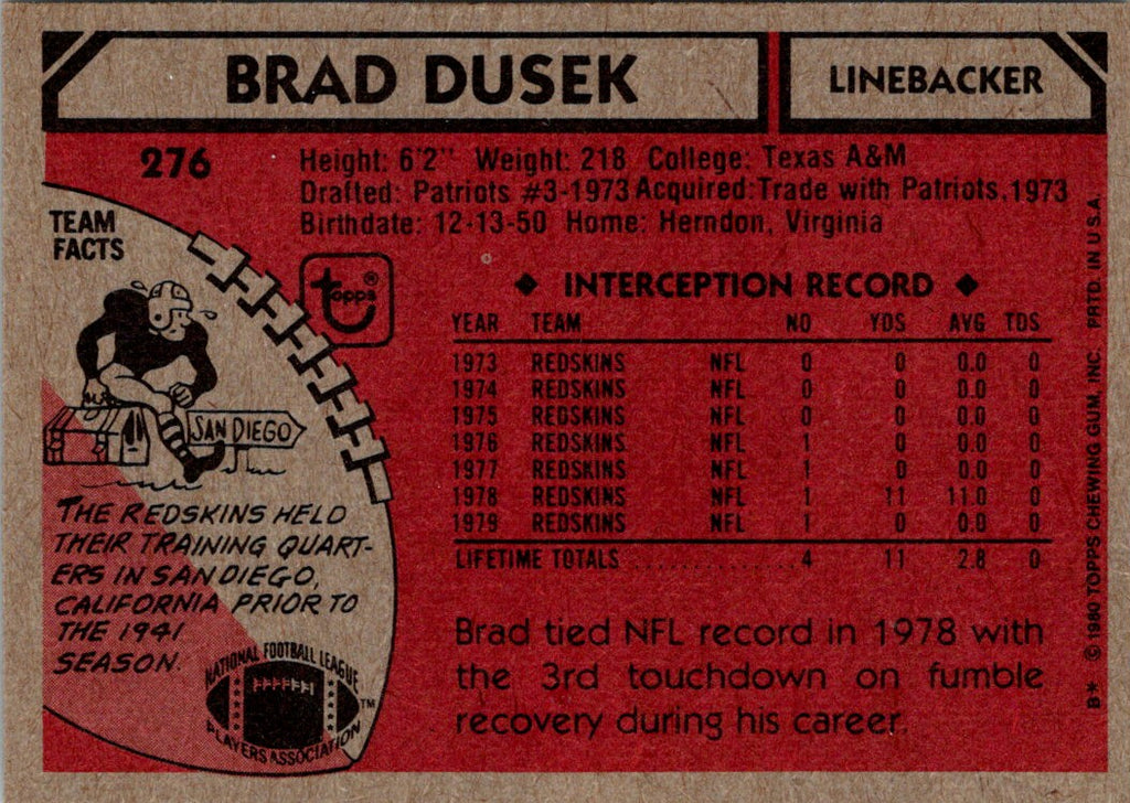 This 1980 Topps Brad Dusek #276 Washington Redskins card is a must-have for any true Redskins fan! Featuring the classic 1980 Topps design, this card is a great piece of memorabilia from one of the greatest teams in NFL history. The card is in great condition and makes a great addition to any collection. With a vibrant photo of the legendary Brad Dusek, this card is sure to be a hit with any Redskins fan. Don't miss your chance to own a piece of Redskins history with this classic card!