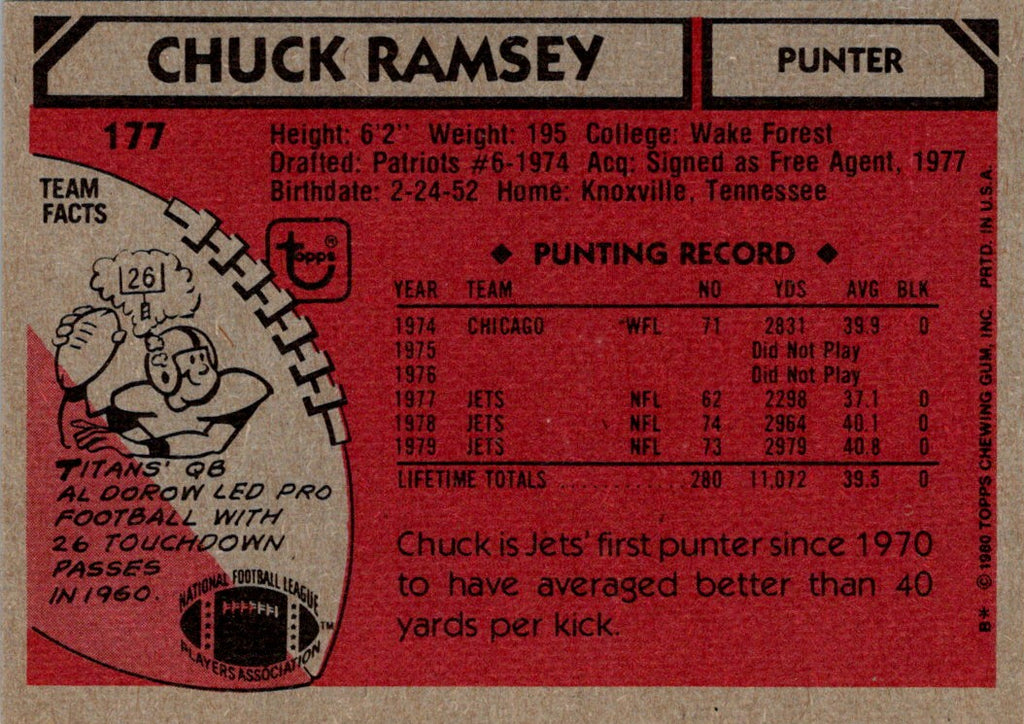 This 1980 Topps Chuck Ramsey #177 New York Jets trading card is sure to be a great addition to any Jets fan's collection! It features a bold image of the legendary quarterback in his iconic Jets uniform. The card displays a great level of detail, capturing Ramsey's facial features and jersey number in stunning clarity. It's a must-have piece of memorabilia for any Jets fan or football card collector. Add this card to your collection today and celebrate the career of one of the greatest quarterbacks in Jets history.