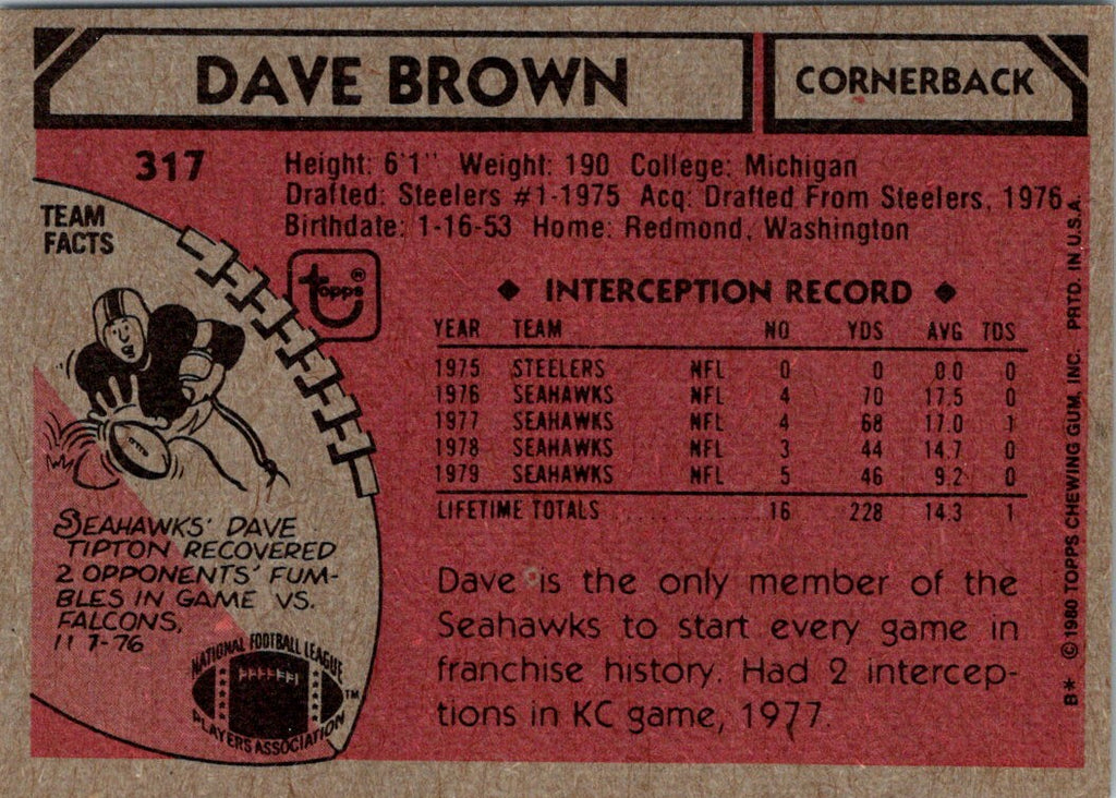 This 1980 Topps Dave Brown #317 Seattle Seahawks card is a great addition to any football fan's collection. Featuring a vibrant blue and white team logo, this card is a great representation of the classic look of the Seattle Seahawks. The card shows Brown in a classic throwing pose, and the back of the card features his stats and a short bio. The card is in near-mint condition and makes a great gift for any Seahawks fan. Add this classic piece of Seattle history to your collection today!