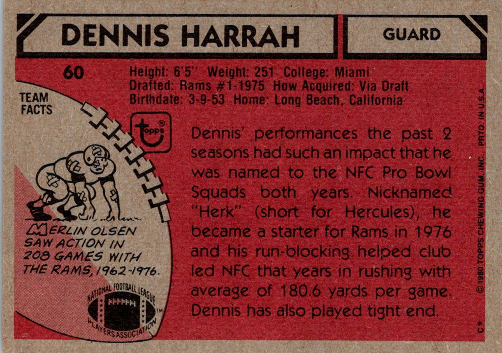 This 1980 Topps card of Dennis Harrah from the Los Angeles Rams is ready to add to your collection! His #60 card features the Rams' blue and yellow colors and a shot of the offensive lineman in mid-play. It's a must-have for any football card collector or any fan of the Los Angeles Rams. Add this card to your collection and show your support for the Rams and Dennis Harrah!