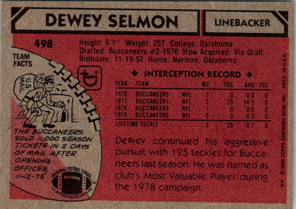 This 1980 Topps Dewey Selmon #498 card is an essential piece of Tampa Bay Buccaneers memorabilia. Featuring a vibrant team logo and a crisp image of Selmon in his classic Buccaneers uniform, this card is sure to make a great addition to any Bucs collection. This card has been professionally graded in near mint condition and is an excellent piece of football history. With the 1980 Topps Dewey Selmon #498 card, you can relive the glory days of the Buccaneers and or just admire the quality of the card. Get yours today and add a true piece of Tampa Bay history to your collection.