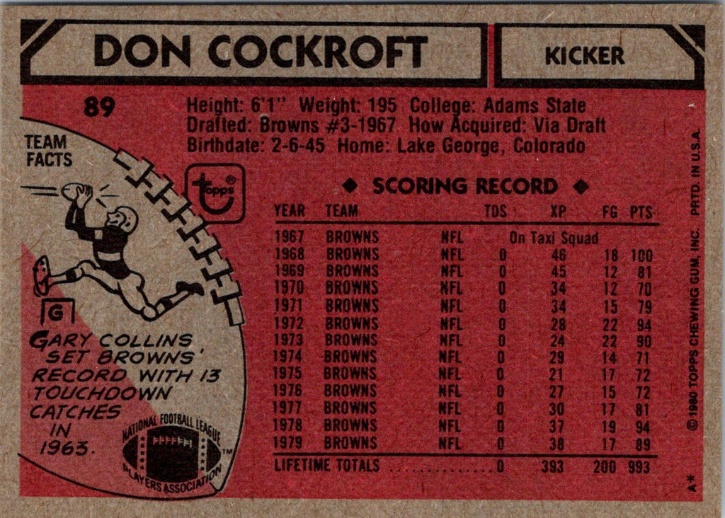 This 1980 Topps Don Cockroft #89 Cleveland Browns card features a great action shot of the legendary punter and kick-off specialist in his classic Browns uniform. The card is in great condition and captures Don at the peak of his career. This card is a great addition to any collection of Cleveland Browns memorabilia and any fan's personal collection. Don Cockroft is a beloved part of the team's storied history and this card is a great way to celebrate his contributions. Don't miss your chance to add this iconic card to your collection.