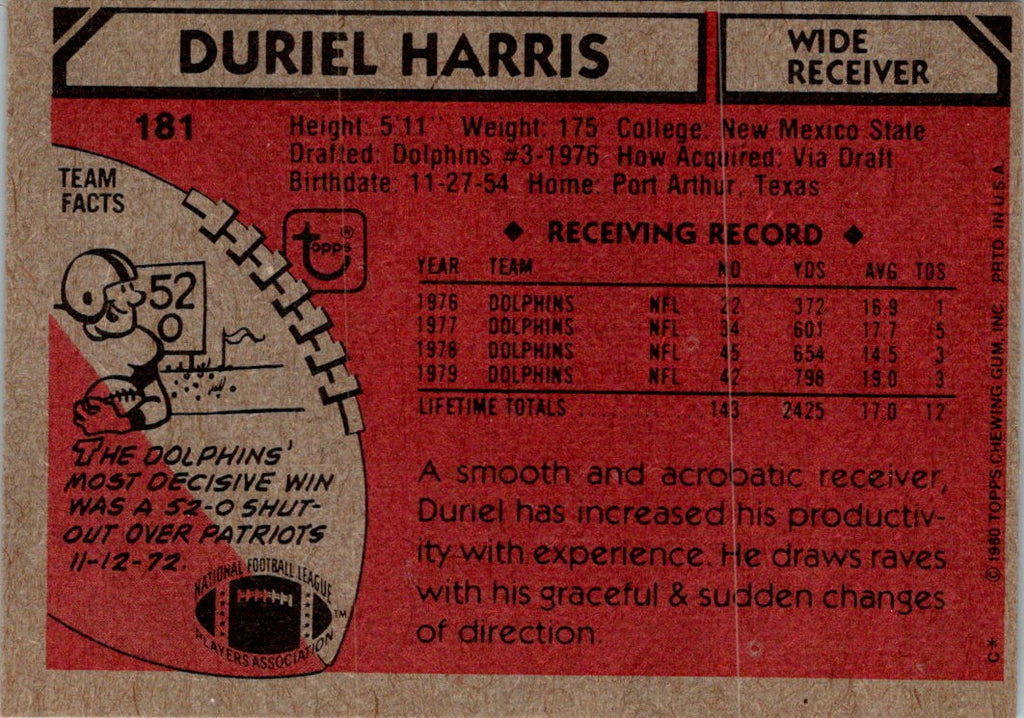 This 1980 Topps Duriel Harris #181 Miami Dolphins card is a must-have for any NFL fan! Featuring a full-color photograph of Harris in action on the field, this card is a great way to celebrate the Dolphins' 1980 season. The card also features stats from that season, making it a great collectible. Add this card to your collection today and show off your Dolphins pride!