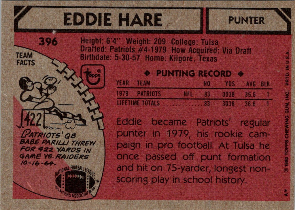 1980 Topps Eddie Hare #396 from the New England Patriots is a must-have for any Patriots fan! This classic card features the iconic Patriots logo and a full-color photograph of Eddie Hare in action. With vibrant colors and a glossy finish, this card will look amazing in any collection. Whether you're looking to complete a set, begin a new collection, or just add to your collection, this card is a great addition!