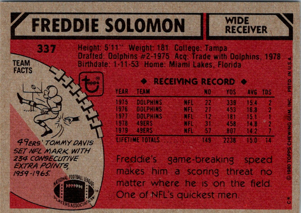 This 1980 Topps Freddie Solomon #337 is the perfect addition to any San Francisco 49ers collection. Featuring a unique design and classic football imagery, this card is sure to please any collector. Freddie Solomon is featured in his iconic 49ers uniform, with a bright red and gold background and a black and white team logo. The card also features a classic Topps design, with its own unique details and color scheme. Get your hands on this classic and add it to your collection today!