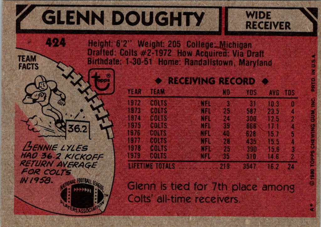 This 1980 Topps Glenn Doughty #424 Baltimore Colts card is a must-have for any collector! With an action shot of the quarterback on the field, it celebrates a legendary player in the history of the Baltimore Colts. Featuring a striking design with bold colors, this card is in mint condition. It is perfect for any fan of the Baltimore Colts and a great addition to any football card collection! Grab it now before it's gone!
