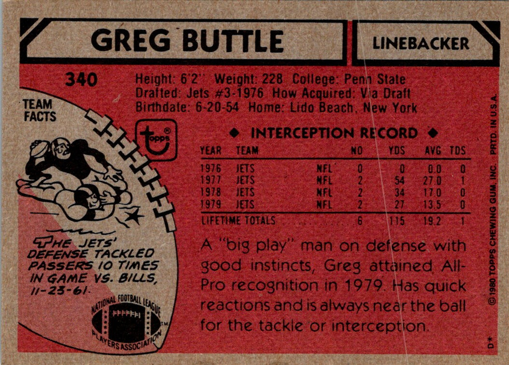 Greg Buttle was one of the most formidable linebackers of his era, and he's immortalized on card #340 from the 1980 Topps football set. This card shows Buttle in his classic red, white and green New York Jets uniform as he reads the offense and gets ready to make a big play. His stats are on the back, along with his career highlights. Own a piece of football history with this iconic Greg Buttle card!