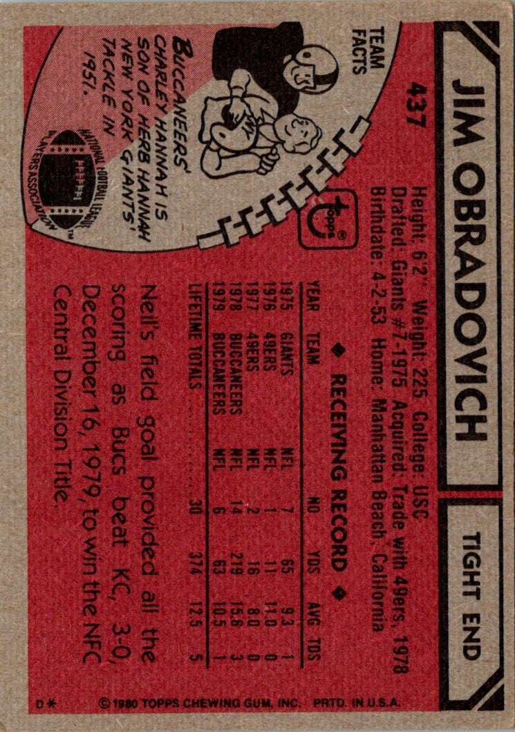 This 1980 Topps Jim O'Bradovich #437 Tampa Bay Buccaneers card is a must-have for any Bucs fan! O'Bradovich was a two-time Pro Bowl selection and a key part of the team's 1979 NFC Central Division Championship. This card features a photo of O'Bradovich in his signature Buccaneers uniform and showcases his incredible athleticism. Add this classic card to your collection today and honor the legacy of the great Jim O'Bradovich!