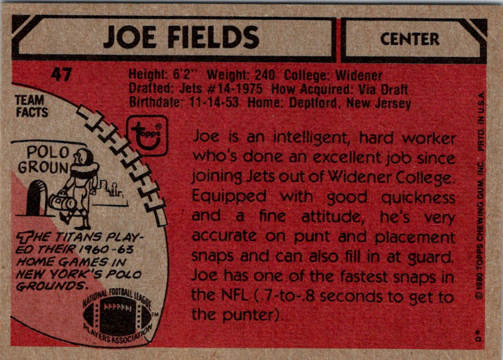 The 1980 Topps Joe Fields #47 New York Jets card is an essential piece of football memorabilia. Featuring a classic action shot of Fields in his green and white Jets uniform, this card captures a moment in the career of an all-time great. Fields was a cornerstone of the Jets defense during the late 1970s and early 1980s, and this card is the perfect way to commemorate his contributions to the team. Add this card to your collection today and relive the glory days of the New York Jets.
