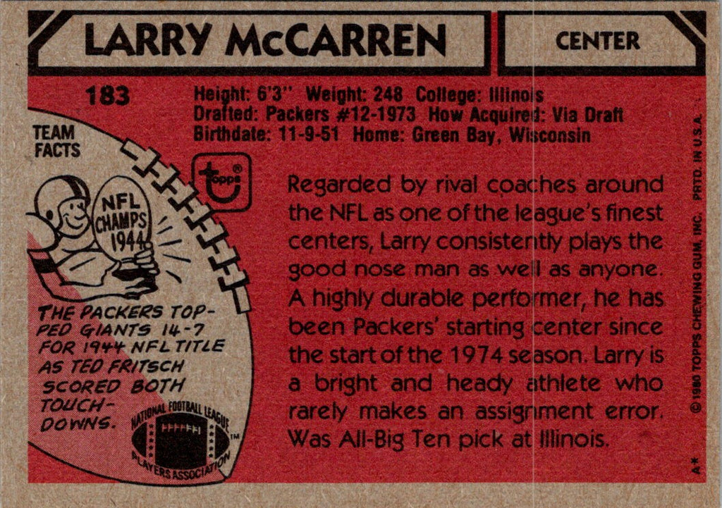 This 1980 Topps Larry McCarren #183 card captures the legendary Green Bay Packers wide receiver in action. With full-color photography and a classic football design, this card is a must-have for any Packers fan. Celebrate the career of one of Green Bay's most beloved players with this timeless card. Add it to your collection today!