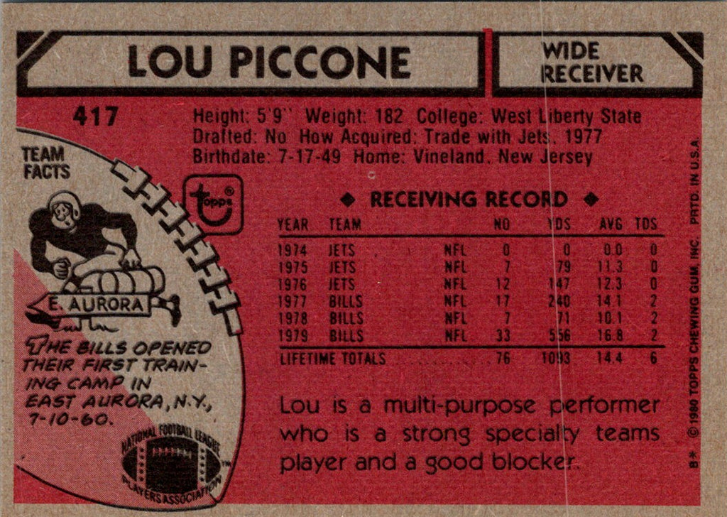 This 1980 Topps Lou Piccone #417 Buffalo Bills card is a great addition to any collection! With bright colors and sharp corners, this card would look great in any showcase. Piccone was a defensive end for the Buffalo Bills from 1974-1980. He was an All-Pro selection in 1976 and was part of the Bills "Electric Company" defensive line. This card is an essential piece of Bills history that any true fan should have!