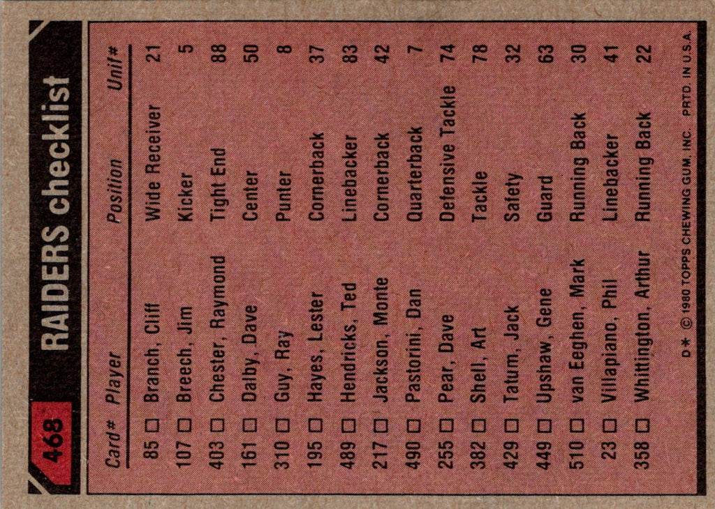 The 1980 Topps Mark Van Eeghen/Cliff Branch/Lester Hayes/Willie Jones #468 Oakland Raiders card is a must-have for any collector of NFL and Oakland Raiders memorabilia. Featuring a full-color photo of the four iconic Raiders players, this card is sure to become a staple of any collection. With vivid colors and detailed graphics, this card is sure to stand out. Perfect for any fan of the Oakland Raiders, this card is a great way to show your support for your favorite team. Add this classic card to your collection today!