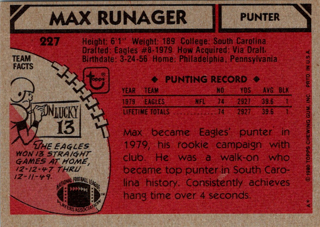 This 1980 Topps Max Runager #227 Philadelphia Eagles card is an essential piece of memorabilia for any true Eagles fan. The card features a dynamic image of Runager in full action on the front, with detailed stats and team information on the back. This card is also in excellent condition with no significant wear, so it will make a great addition to any collection. Get this card today and take your collection to the next level!