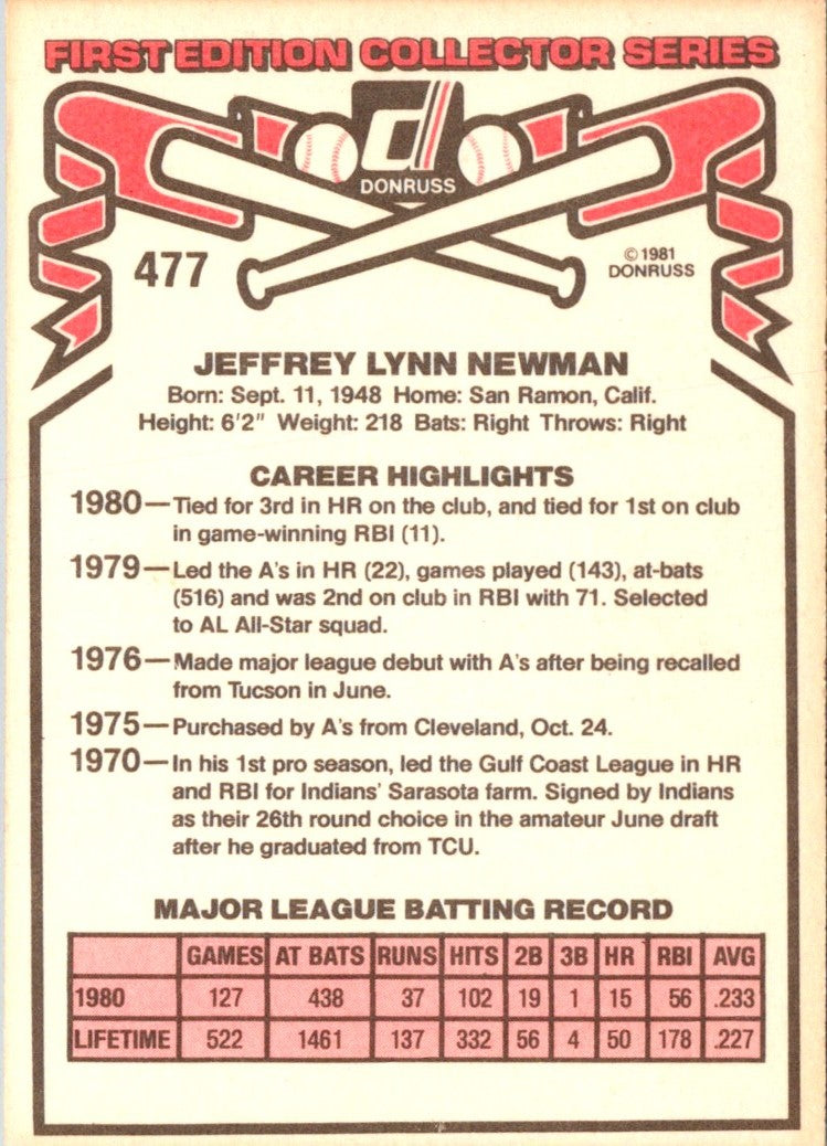 This 1981 Donruss Jeff Newman #477 Oakland Athletics card is a great addition to any baseball card collection. The card is in near-mint condition and is a great way to commemorate the 1981 season and celebrate the career of Jeff Newman. The card features a glossy finish and a full-color photo of Newman in his iconic Athletics uniform, making it a great way to show your love for the Athletics. It's a must-have for any A's fan!
