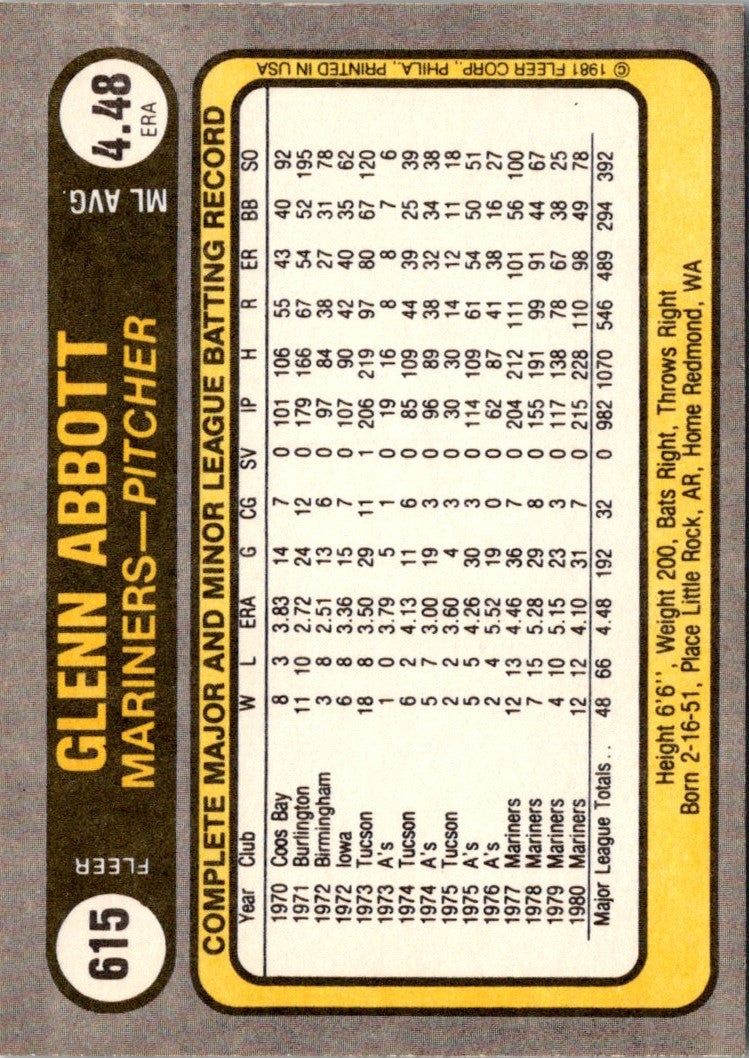 This 1981 Fleer Glenn Abbott #615 Seattle Mariners card features a bold and vibrant image of the legendary pitcher during his time with the Mariners. It is a must-have for any fan of baseball or the Seattle Mariners. The card is in excellent condition, featuring sharp edges and corners, and a clean surface with vibrant colors. It is an iconic piece of baseball history that will be a great addition to any collection.