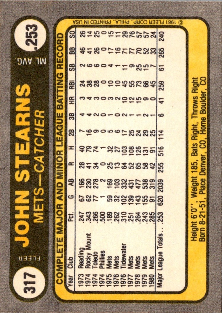 1981 Fleer John Stearns #317 New York Mets is a must-have for any Mets fan! This collectible card features a stunning photo of Stearns in action, wearing his classic New York Mets uniform. Add this card to your collection and show your support and admiration for the legendary catcher. The back of the card includes a detailed biography of Stearns's career, giving you a great insight into his achievements. With 1981 Fleer John Stearns #317 New York Mets, you can relive the glory days of the Mets and honor a truly remarkable player.