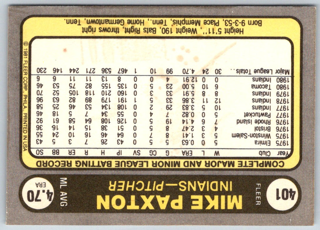 This 1981 Fleer Mike Paxton #401 Cleveland Indians card is the perfect addition to any fan's collection. Featuring an iconic image of the former Indians pitcher, this card is sure to bring back memories of the team's glory days. The card features a vibrant full-colour design with a glossy finish, bringing this card to life. The back of the card provides valuable stats and information, making it the perfect memorabilia item. Add this card to your collection today and relive the golden era of Cleveland Indians baseball.