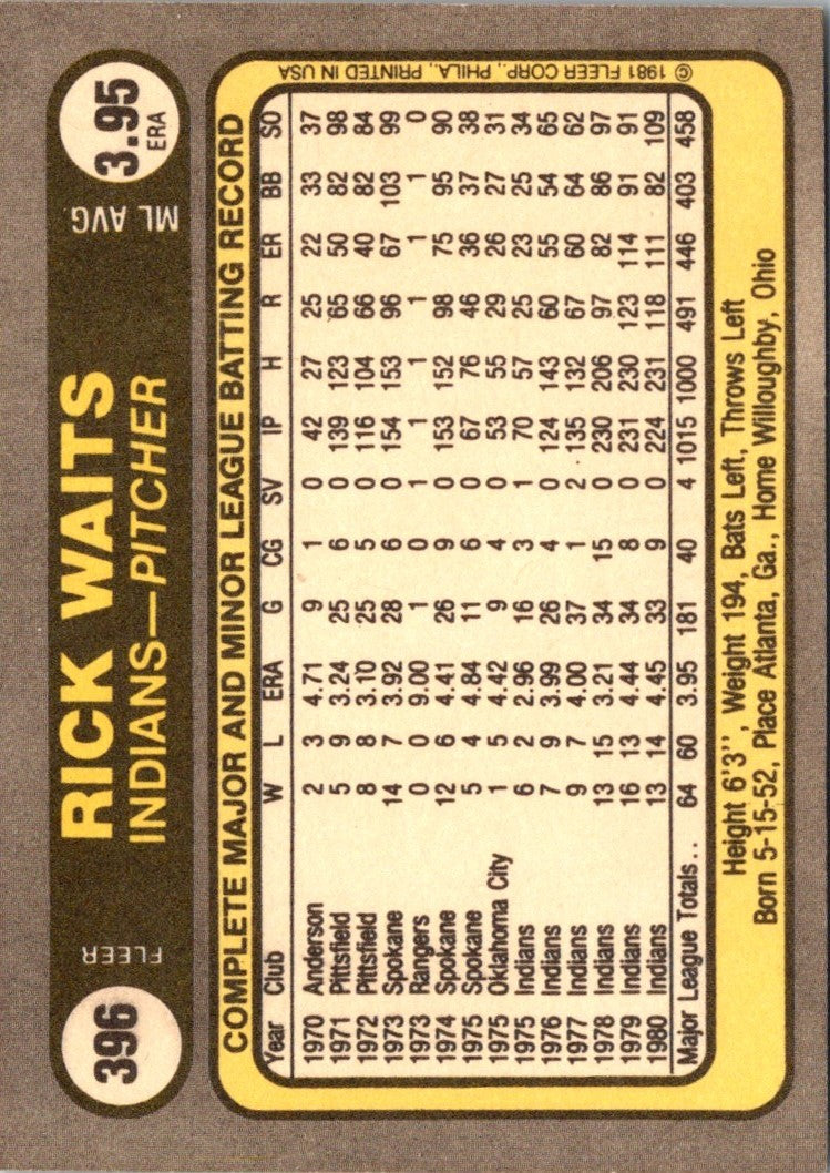This 1981 Fleer Rick Waits #396 Cleveland Indians card features a classic portrait of the pitcher during his time with the Indians. The card is in excellent condition, with clean edges, vibrant colors, and clear text. Waits had a strong career with the Indians, and this card is a great way to commemorate his time with the team. Add this card to your collection and relive his time with the Indians.