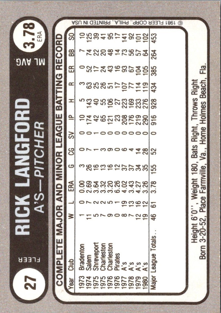 This 1981 Fleer Star Sticker featuring Rick Langford of the Oakland Athletics is a must-have for any baseball fan. This classic sticker features Langford in his iconic A's uniform, with a bold yellow border that's sure to stand out in any collection. The vibrant colors of this sticker will bring your collection to life, and it's a great way to show your support for the A's. Add this sticker to your collection today and show your allegiance to one of the most iconic teams in baseball history!