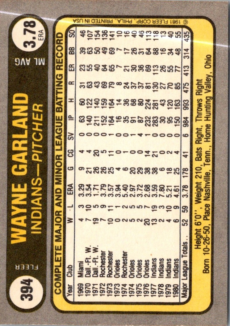 This 1981 Fleer Wayne Garland #394 Cleveland Indians card is a great addition to any baseball card collection. Featuring a classic action shot of Garland in his Indians uniform, this card has been well-preserved and is in near-mint condition. The back of the card includes Garland's career stats and a brief overview of his time with the Indians. It is a great way to honor one of the team's legendary players and a must-have for any Cleveland Indians fan.