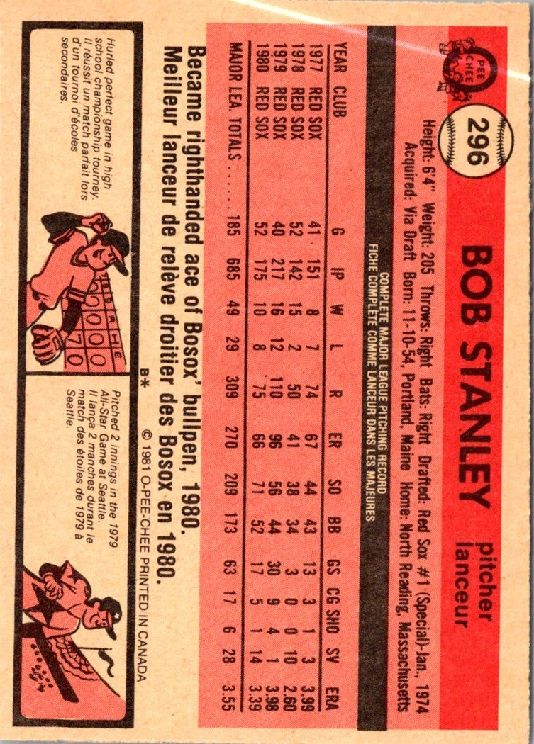 The 1981 O-Pee-Chee Bob Stanley card #296 is a must-have for any die-hard Boston Red Sox fan. This card features Stanley in his Red Sox uniform as he winds up for a pitch. The card captures the classic look and feel of the time, and it will remind you of the great MLB teams of the 1980s. With bright colors and sharp details, this card will look great in any collection. Add this iconic card to your collection to show your support for the Boston Red Sox!
