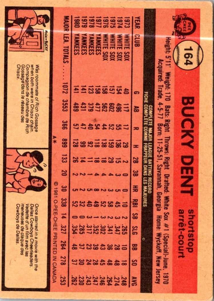 This 1981 O-Pee-Chee Bucky Dent #164 New York Yankees card is a great addition to any baseball card collection! The card features a classic photograph of Bucky Dent in a Yankees uniform, with his signature pose. The card is in excellent condition, with crisp edges and vibrant colors. The back of the card features Dent's career stats, as well as a brief summary of his accomplishments. Whether you're a fan of the Yankees or of Bucky Dent himself, this card is sure to delight!