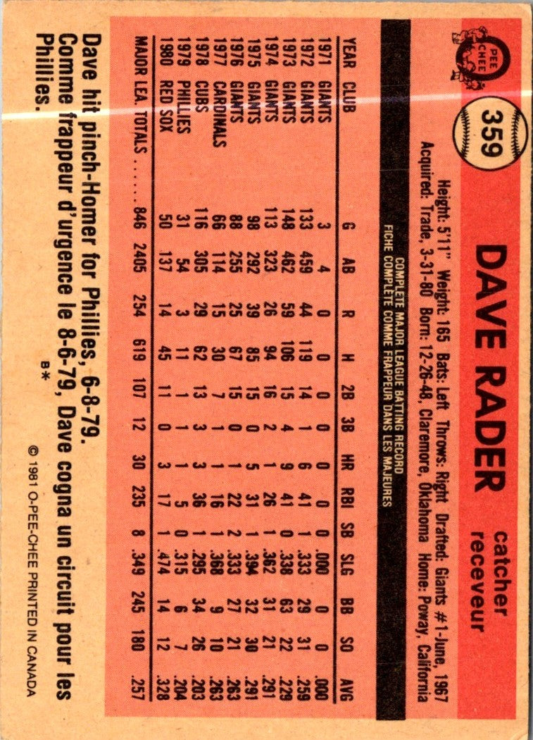 The 1981 O-Pee-Chee Dave Rader #359California Angels card is a must have for any baseball enthusiast! This card features a picture of Dave Rader in a classic batting stance, ready to hit one out of the park! The card also has an O-Pee-Chee logo on the lower right corner of the card, which is a great collector's item. The card is in excellent condition, with no bends, creases, or tears. This card is a great addition to any collection and makes for a great gift! Get it now!