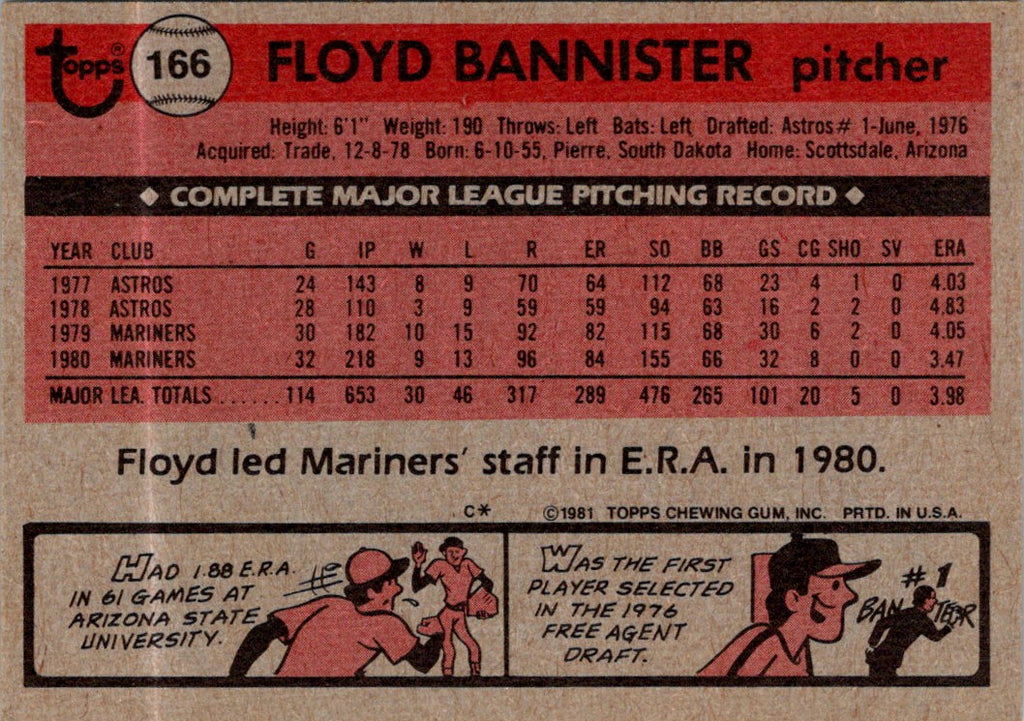 This 1981 O-Pee-Chee Floyd Bannister #166 Seattle Mariners baseball card is a great addition to any collection. Featuring Bannister's classic batting stance in crisp color, this card captures a moment in the history of the Seattle Mariners. This card is sure to make a great gift for any Seattle Mariners fan or card collector. Get your hands on this vintage card today!