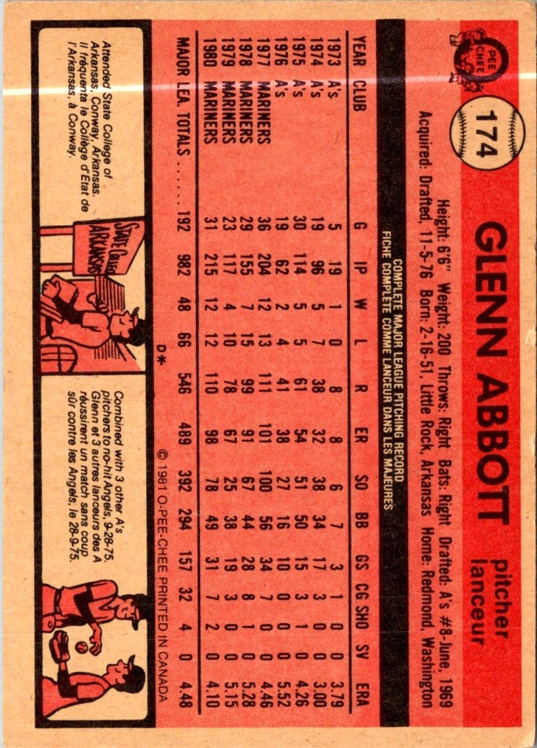 This 1981 O-Pee-Chee Glenn Abbott #174 Seattle Mariners card will make a great addition to your baseball memorabilia collection. Show your team spirit with this vintage single card featuring Abbott in his classic Mariners uniform. It's a must-have for any Mariners fan or collector of vintage cards. The card is in near mint condition with sharp corners and minimal wear. Add it to your collection today and show your pride for the Seattle Mariners!