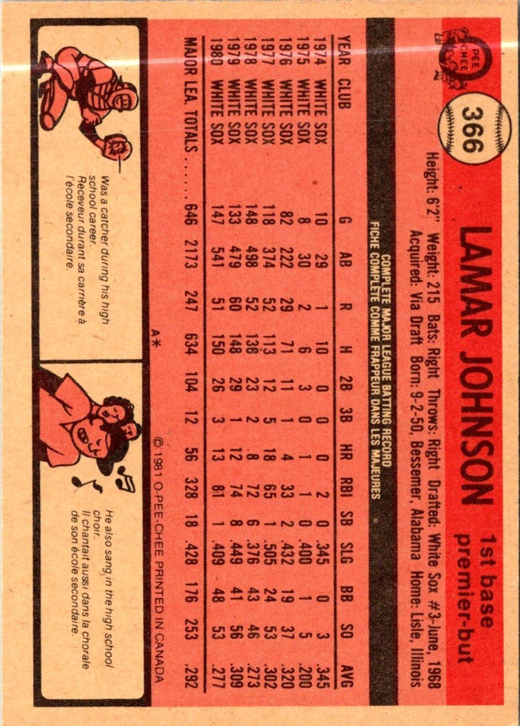 The 1981 O-Pee-Chee Lamar Johnson baseball card is a great addition to any collection! Show off your love of the Chicago White Sox with this classic card featuring the team's talented outfielder. This card features a full-color photograph of Johnson in action on the field and a brief description of his career highlights on the back, making it a great addition to any sports fan's collection. Show off your White Sox pride and add this card to your collection today!
