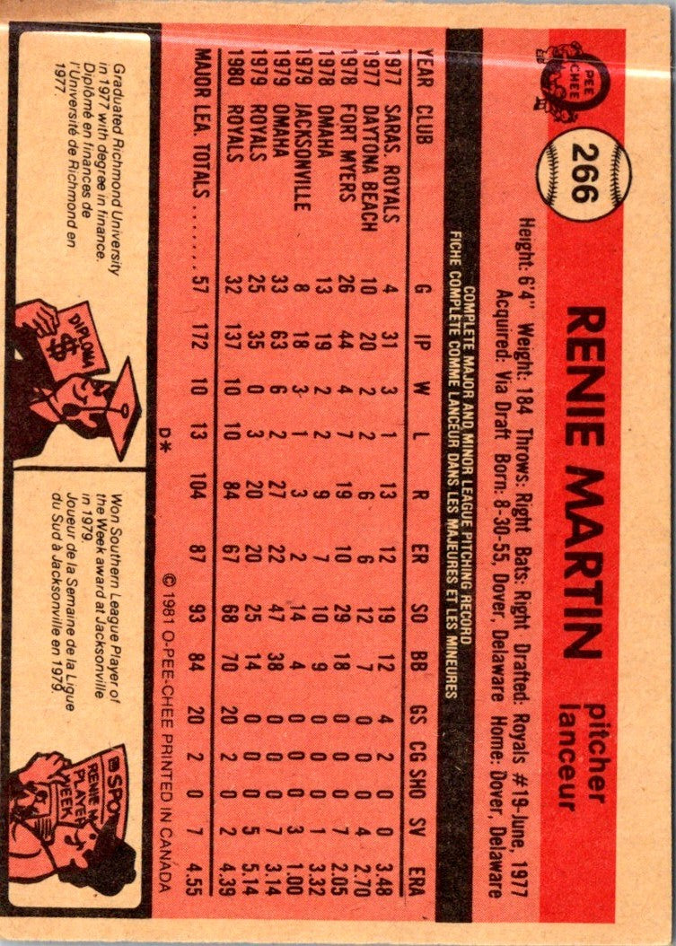 This 1981 O-Pee-Chee Renie Martin #266 Kansas City Royals card features a full-color action photo of the player. Martin was an important part of the Royals' infield for many years, and this card is a great way to remember his time with the team. The card's reverse includes a detailed biography, as well as statistics from Martin's career. It's a must-have for any Royals fan or baseball card collector. Grab your copy today and add it to your collection!