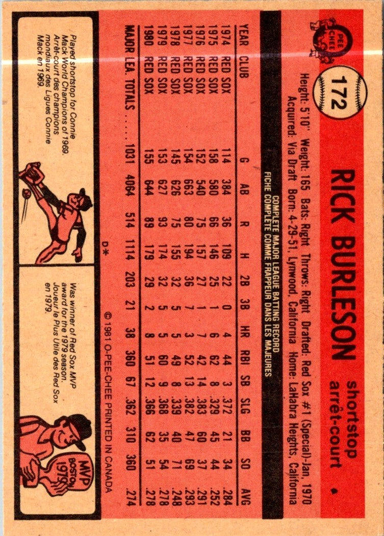 This 1981 O-Pee-Chee Rick Burleson #172 card from the California Angels celebrates the career of an All-Star infielder. Burleson was the team's starting shortstop from 1975 to 1982, and in 1977, the Angels' first year in the American League West, he was named to the All-Star team. Burleson's card features a colorful head shot of him in his Angels uniform and batting helmet. It's a great way to commemorate the career of a beloved Angels player and a must-have for any fan of the team. Add this iconic card to your collection to honor the legacy of Rick Burleson.