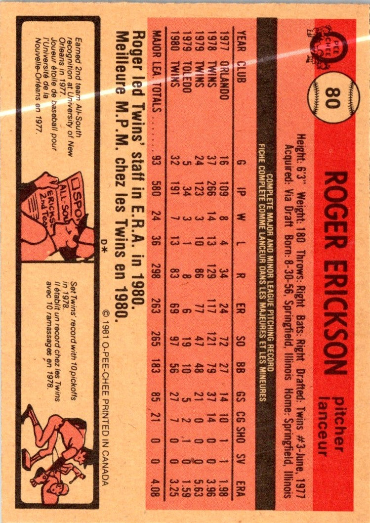 This 1981 O-Pee-Chee Roger Erickson #80 Minnesota Twins card is a great addition to any collection. Featuring a full color action shot of Roger Erickson on the front and his stats and biography on the back, this card is sure to be a hit with any Twins fan. This card is in excellent condition - no creases, scuffs, or marks - making it a great piece to add to your collection. Show off your Minnesota Twins pride with this stunning Roger Erickson card!