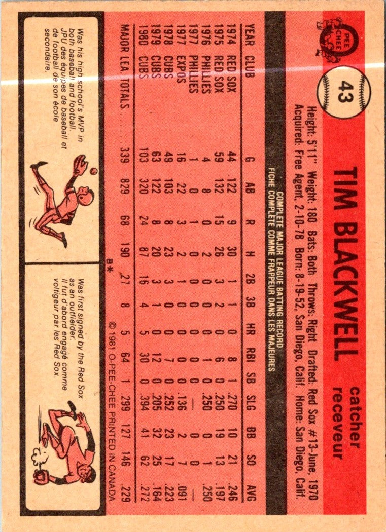 This 1981 O-Pee-Chee Tim Blackwell #43 card is a must-have item for any Chicago Cubs fan. Featuring a brilliant, full-color image of the beloved player in the iconic Cubs uniform, this card is sure to become the centerpiece of any fan's collection. The card is printed on premium card stock and is in excellent condition. It is the perfect way to commemorate Tim Blackwell's legacy with the Cubs, and a great way to show your support for the team. Add this card to your collection today and keep the memory of the great Tim Blackwell alive for years to come!