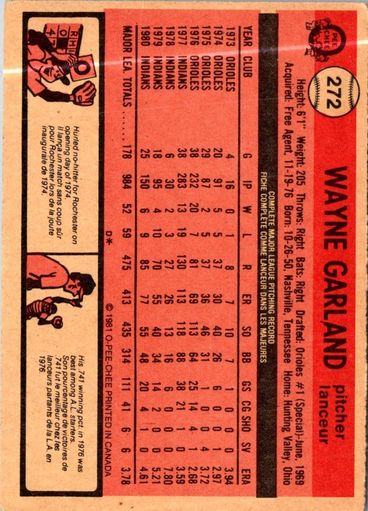 Wayne Garland was a right-handed pitcher for the Cleveland Indians in 1981 and is featured in the O-Pee-Chee series. This card is in excellent condition and features a full-color portrait of Garland with his Indians jersey and cap. On the back of the card are his stats and career highlights, allowing you to learn more about this talented player. This is the perfect item for any Cleveland Indians or baseball fan looking to add to their collection. Get your 1981 O-Pee-Chee Wayne Garland #272 Cleveland Indians card today!