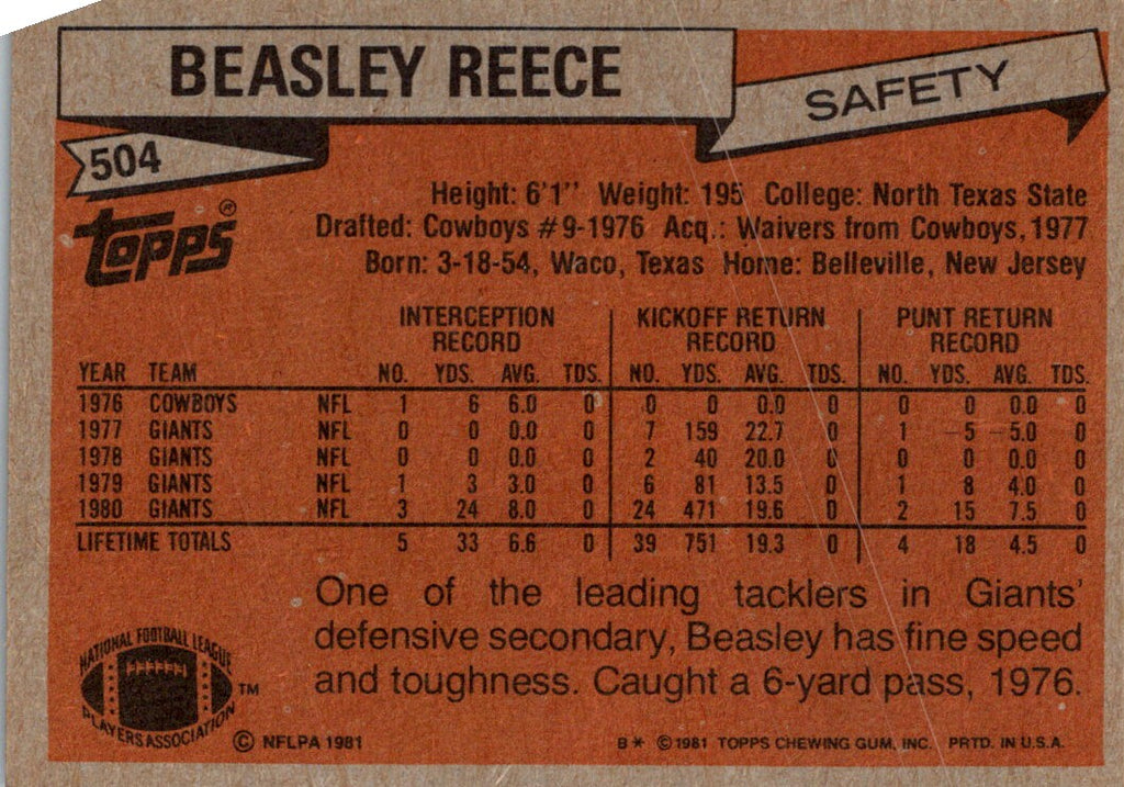 This 1981 Topps Beasley Reece #504 card is in great condition and is sure to be a great addition to your New York Giants collection! This card is full of detail, featuring a crisp image of Reece in his iconic uniform. The reverse side has a detailed description of his career stats and achievements up to that point. This card is a must-have for any true Giants fan! Add this beautiful piece to your memorabilia today!