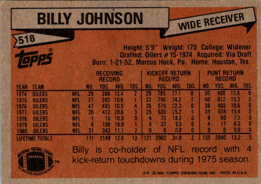 This 1981 Topps Billy Johnson #518Houston Oilers card is a must-have for any Oilers fan or football card collector. Featuring a great action image of Billy Johnson on the field, this card is a great way to commemorate the 1981 season. The card is in great condition and is the perfect addition to any collection.