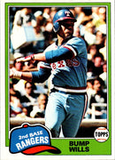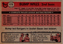 1981 Topps Bump Wills #173 is a must-have for any Texas Rangers fan. This classic card features a stunning color photo of the Rangers' second baseman in action, with a white and blue border surrounding the image. Wills is captured mid-swing, with a glove in one hand and a bat in the other, ready to make contact with the ball. The back of the card displays Wills career stats, including his .280 batting average and .348 on-base percentage. His name is printed in bold red along the top, adding to the card's timeless appeal. Own a piece of Texas Rangers history with 1981 Topps Bump Wills #173.