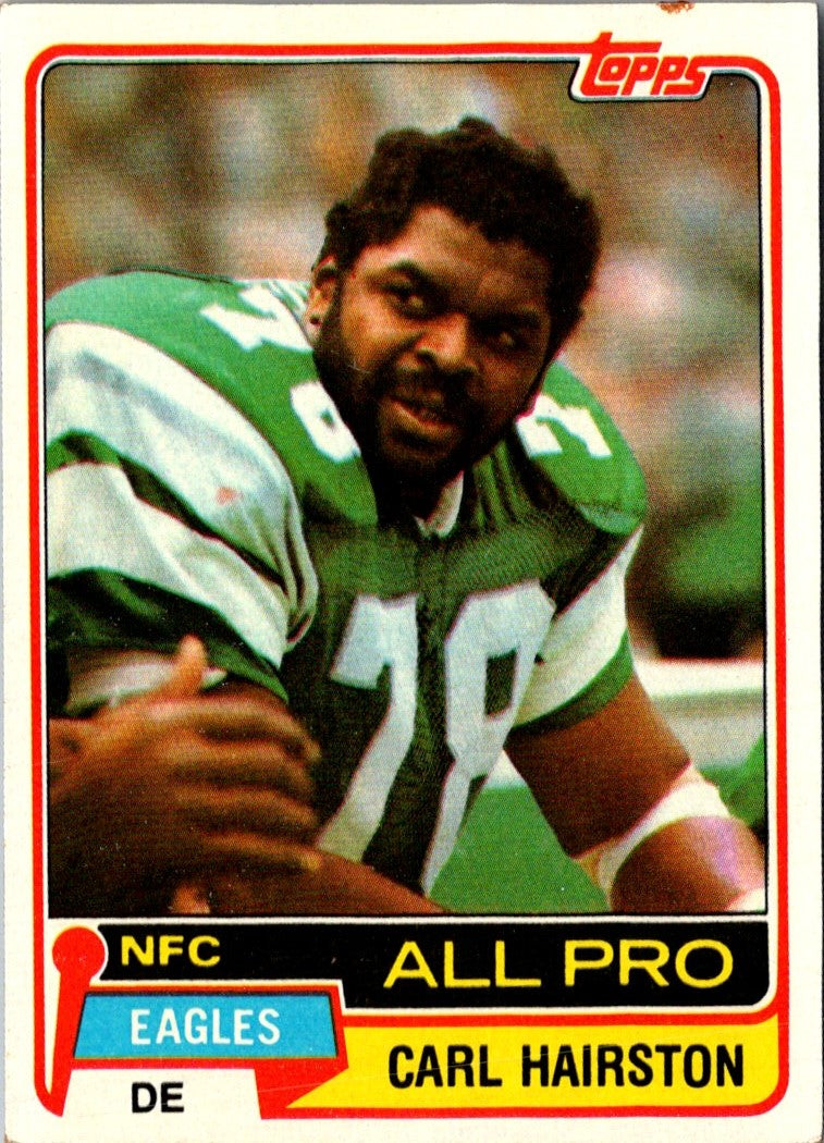 This 1981 Topps Carl Hairston #480 Philadelphia Eagles card is a great addition to any football card collection. This card features a color image of the Eagles' defensive back in action against an opposing team. The reverse side includes an action shot of Hairston, his vital stats, and a brief biography. This card is sure to be a great conversation piece amongst friends and family. Add this vintage card to your collection today!